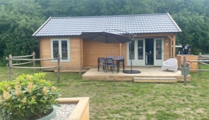 Luxus-Holzchalet A/C2 Schlafzimmer | ca. 45 m² (max. 2 + 2 Personen)Das Luxus-Holzchalet (max. 2 Erwachsene + 2 Kinder) ist ca. 45 m² groß. Ideal für Familien, die Platz mögen. Die Chalets stehen weit auseinander, so daß Sie auch im Urlaub Ihre Privatspäre genießen können. Das Chalet hat 2 Schlafzimmer mit ingesamt 4 Schlafgelegenheiten. Die Chalets verfügen über eine kombinierte Klimanlage/ Heizung. Einteilung Luxus-Holzchalet A/CWohnbereich mit gemütlichem Essbereich und vollständig eingrichteter Küche mit einem Kühlschrank, einem Kochfeld mit 4 Gasbrennern und Kaffeemaschine. Im Elternschlafzimmer befindet sich ein Doppelbett, ein Kinderzimmer mit Etagenbett. Das Badezimmer hat einen Schrank, Waschtisch, Duschkabine und WC. Gemütliche Veranda mit Gartenmöbeln und ein geräumiger Vorgarten mit Gras.