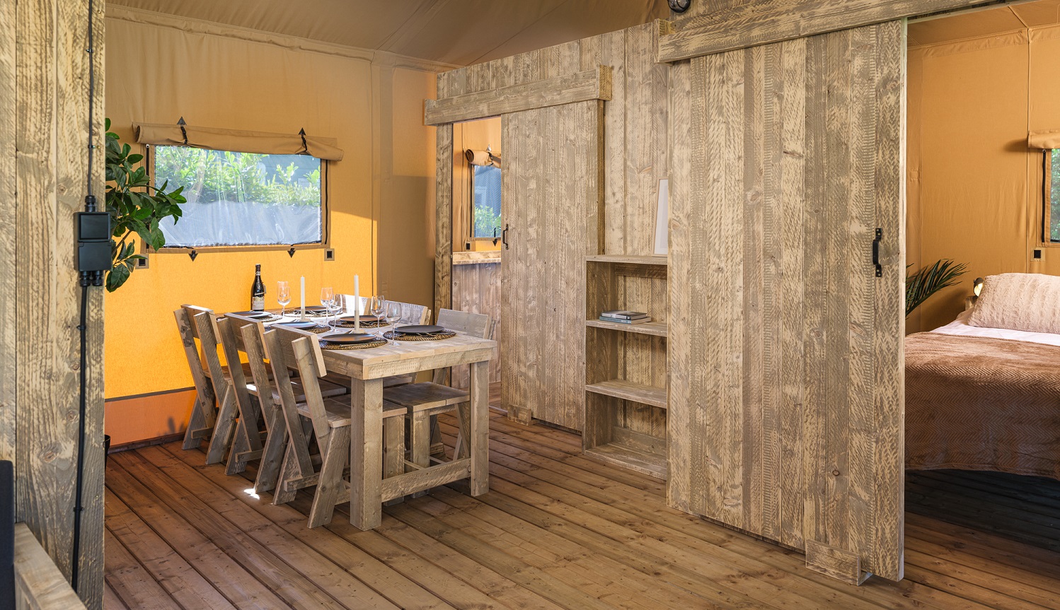 Schon beim Betreten der Grand Lodge werden Sie es spüren: Hier erwartet Sie keine gewöhnliche Glamping-Unterkunft. Sie ist ideal für Familien oder Paare, die viel Platz, ein besonderes Ambiente und ein bisschen Abenteuer suchen, ohne dabei auf Komfort verzichten zu müssen. Warme Holzböden, einladende Möbel und natürliche Farbtöne schaffen eine ruhige Atmosphäre. Große Fenster und Fenstertüren verbinden Innen- und Außenbereich harmonisch.