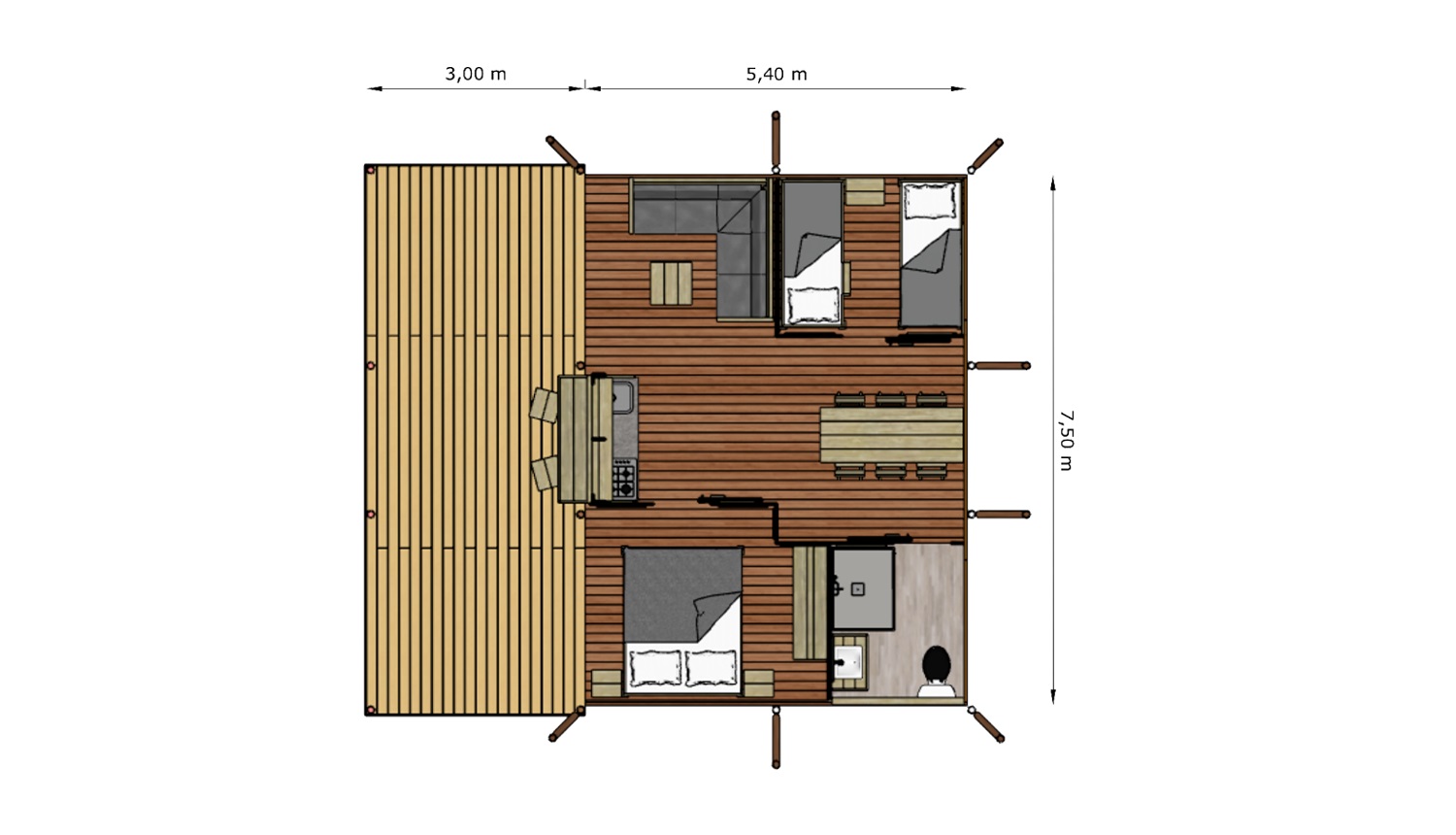 Einteilung Grand Lodge mit BadezimmerIm Inneren finden Sie alles, was Sie für einen unbeschwerten Urlaub benötigen. Die voll ausgestattete Küche (mit großem Kühlschrank mit Gefrierfach, 4-Flammen-Gasherd, Wasserkocher und Nespresso-Maschine) macht das Kochen zum Kinderspiel, egal ob Sie ein schnelles Mittagessen oder ein aufwendigeres Menü zubereiten möchten. Das geräumige Badezimmer verfügt über eine Regendusche, ein Waschbecken und eine Toilette. Die Schlafzimmer sind geschmackvoll mit bequemen Betten eingerichtet, sodass sich alle nach einem erlebnisreichen Tag entspannen können. Es gibt ein Hauptschlafzimmer mit einem Doppelbett (140 x 195 cm) und ein Schlafzimmer mit einem Etagenbett und einem Einzelbett (jeweils 80 x 195 cm). Das absolute Highlight ist jedoch die einzigartige Outdoor-Bar. Öffnen Sie das Sonnensegel komplett, stellen Sie die Barhocker auf und schon haben Sie Ihre eigene Lounge unter freiem Himmel – der perfekte Ort für ein entspanntes Frühstück in der Morgensonne, einen leckeren Drink zum Tagesausklang oder ein abendliches Spiel. Die geräumige, überdachte Holzveranda bietet außerdem eine bequeme Bank und zwei Liegestühle mit wetterfesten Kissen, einen Picknicktisch mit zwei Bänken, eine Hängematte und einen Gasgrill. | |||||
