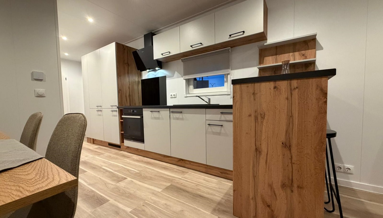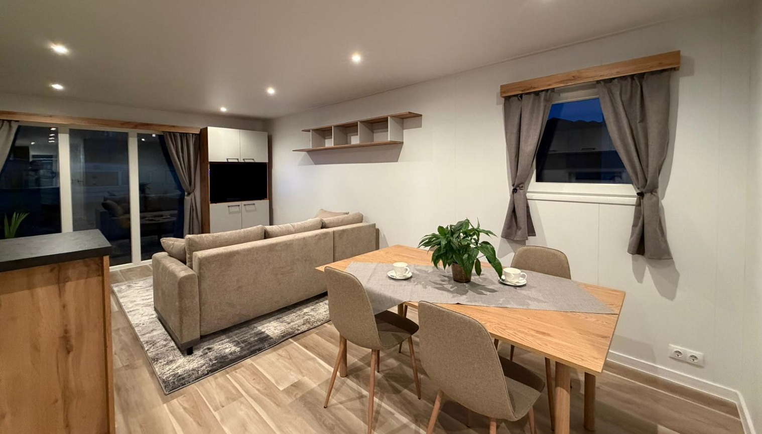 Einteilung des Mobilheims Titan auf dem Campingplatz Borken am SeeDas helle Wohnzimmer verfügt über eine großzügige Sitzecke mit bequemem Sofa und einem separaten Essbereich. Die offene Küche ist mit allem Komfort ausgestattet: einer gemütlichen Bar, einem 4-Flammen-Herd, einer Kombi-Mikrowelle und einem hohen Kühlschrank mit Gefrierfach. Selbstverständlich sind auch eine Kaffeemaschine (Nespresso) und ein Wasserkocher vorhanden. Titan hat drei Schlafzimmer: eines mit einem Doppelbett und zwei Schlafzimmer mit jeweils zwei Einzelbetten. Das Badezimmer ist modern eingerichtet mit Waschbecken, Badezimmerschrank und Duschkabine; die Toilette ist separat. Draußen können Sie die großzügige Holzveranda mit Überdachung, komplett mit Lounge-Set und Liegestühlen, genießen. Grillen ist erlaubt (nicht auf der Holzterrasse). | |||||